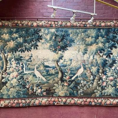 AUBUSSON Tapisserie en laine polychrome dite verdure à décor sylvestre et de volatiles sur fond d'architectures. Bordure fleurie.